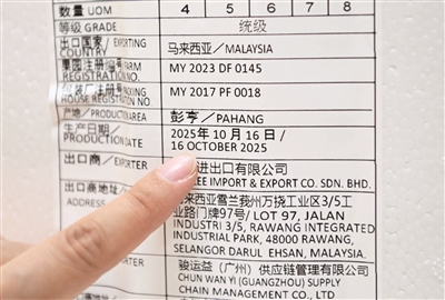 10月17日,在广州白云区一家水果经销商的运营中心,工作人员展示刚到货的榴莲鲜果标签。
