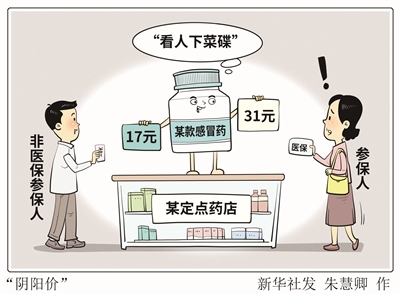 同一家药店同一款感冒药,非医保参保人购买是17元,参保人购买却变成31元,相差近一倍。网友吐槽“药店先问刷不刷医保,再推荐,满满套路”。药店“看人下菜碟”的“阴阳价”行为,侵蚀医保基金安全,损害参保人切身利益,削弱公众对医保制度的信任,必须坚决整治。■新华社发 朱慧卿 作