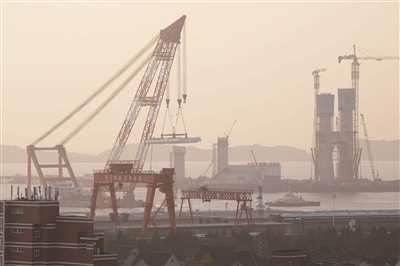 11月15日,在浙江杭州湾海盐侧离岸约0.4公里的海面上,重达626吨的钢梁在浮吊船的吊装下,精准架设到8号主墩上,标志着由沪杭客专公司建设管理、中铁大桥局承建的杭州湾跨海铁路桥北航道桥钢梁开始架设,桥梁正式进入上部结构施工阶段。