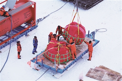 北京时间12月3日凌晨,工作人员在“雪龙2”号船侧冰面开展油囊装车作业。