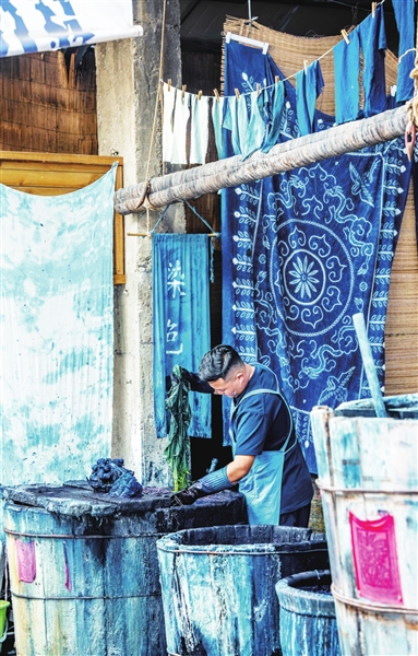 白族扎染以板蓝根为主要染料,工序包含绘图、制版、印花、扎花、染色、漂洗、拆花、晾晒等。其中,扎花、浸染为核心步骤,手工艺人执针走线,在布料上扎出不同类型的图案,再用植物染料染出蓝底白花、生灵百态。2006年,白族扎染被列入第一批国家级非物质文化遗产名录。■新华社记者 胡超 摄