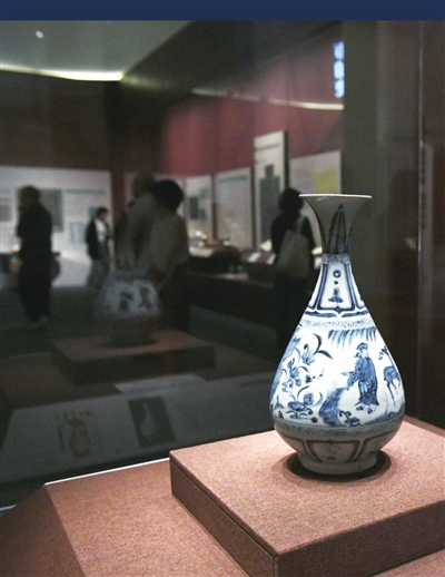12月3日在“互利天下:广东外贸一千年”展览上拍摄的元代青花人物图玉壶春瓶。