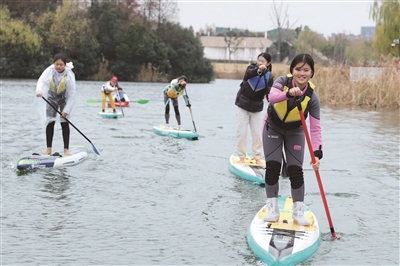 在新江湾城文体公园,另一幅动静相宜的画卷同时展开。清澈的河道中,市民们在专业教练指导下,以一场“新年第一划”的皮划艇活动,划破平静水面,划响健康序曲。不少外国友人也兴致勃勃加入其中,桨板翻飞间,欢声笑语交织成独特的国际化运动风景线。