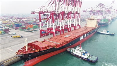 1月4日,澳洲直航新航线首班船舶——“地中海杰西尼亚”轮靠泊山东港口青岛港(无人机照片),该港2026年首条外贸新航线正式开通。■新华社发 张进刚 摄