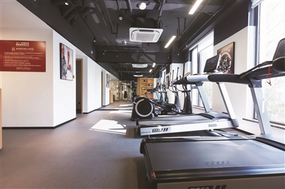 在二楼,还有一个理发、美甲空间,同样实行公益价;影音室外的留言板上贴着每周排片表,住户可以用便利贴留言“点单”;24小时开放的健身房里,除了健身器材,还配备了运动与健康类图书。