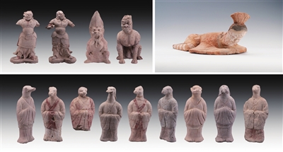 拼版照片:新疆吐鲁番市巴达木东晋唐时期墓地出土的陶俑(资料照片)。
