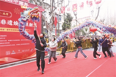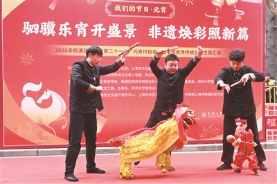 记者了解到,本届行街会上不仅有杨浦本土表演团队,还汇集了来自上海各区及外省市的一批非遗表演队伍——松江区新浜镇花篮马灯舞队手挑花篮,转圈舞动,灵动俏皮,彰显出一股子民间草根艺术的鲜活劲儿;浦东新场镇行街版江南丝竹乐婉转悠扬,笛声穿过喧闹的人群,给这条马路平添几分水乡雅韵;虹口精武武术队一招一式尽显功底,逗得不少孩子们有样学样、比划起来。还有江苏省苏州七都提线木偶、新疆驻沪人员新疆舞等,生动展现多元文化交融场景,形成一条流动的“非遗长廊”。