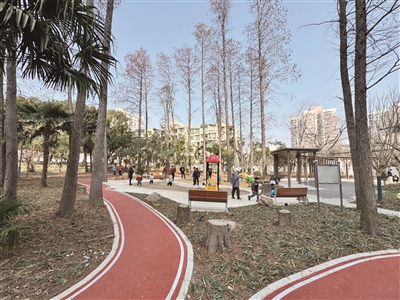 如今,崭新的硕园已成为社区居民最爱去的场所。阳光透过新栽的树木洒在步道上,老人们在适老化座椅上聊天晒太阳,孩子们在安全的塑胶场地上奔跑嬉戏。红枫与蜡梅,枇杷与香柚,园中已栽下许多果树与花木,绿意盎然。这片焕发新生的绿地,不仅改善了居住环境,更温暖了居民的心。